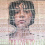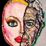 Distortion, 2024, discarded clothing, plastic mesh, photo, human hair, thread, yarn, 26 x 26 x 2 in