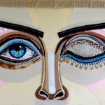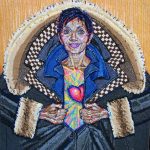 Chameleons and Eye, 2022, discarded clothing and faux skin, 16 x 16 x 2 in